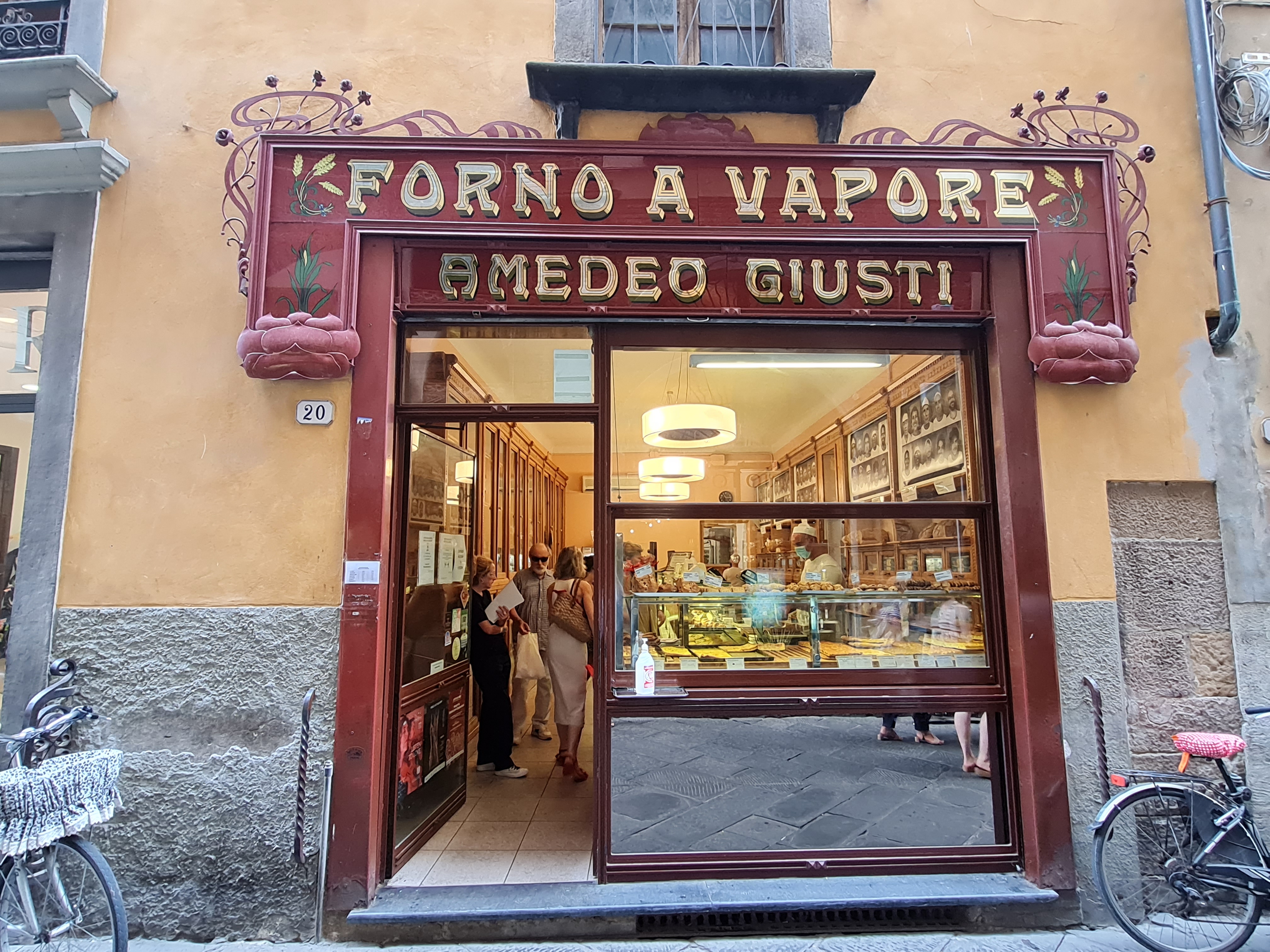 Il Forno a vapore Amedeo Giusti, ancora oggi conosciuto come “Panificio Giusti”, nasce nel 1823 a Lucca, in San Michele, per opera di Michelangelo Larini. L’attività di panificio è stata portata avanti per quasi 200 anni negli stessi locali. All’inizio del 1900 l’allora trentenne Amedeo Giusti acquistò il forno di via S. Lucia e lo trasformò puntando, così come accade oggi a un secolo di distanza, sul forno a vapore, come scritto a chiare lettere dorate sull’insegna in stile liberty, con decorazioni floreali ai caratteri delle lettere su sfondo rosso scuro. La sua fama si diffuse ben presto e, negli anni successivi, fu aperto un secondo panificio in via della Stufa. Nel 1943, in piena Seconda guerra mondiale, iniziò la gestione di Guido, figlio di Amedeo, che insieme alla madre Enrichetta rifornivano di pane la città, alimento principe in un periodo di grande miseria, iniziando anche la vendita al dettaglio di quanto prodotto. Nel corso del tempo fu poi ampliata la superficie di vendita del panificio, andando a occupare parte della zona destinata alla cottura del pane, che a quel tempo era esclusivamente a legna. La famiglia Giusti gestì l’attività fino al 1975, quando il forno fu rilevato da due dipendenti di Guido, Giuliano Rugani e Marino Dianda, che portarono avanti con successo la gestione fino al 1999 quando, per raggiunti limiti di età, Marino lasciò la gestione del panificio alla figlia Monica, che ancora oggi conduce l’attività insieme a Giuliano Rugani e al marito Luca Nardi. Tuttora la produzione del pane avviene nel rispetto della tradizione, ma è stata ampliata e diversificata: il forno produce 45 tipi di pane e decine di tipi di focaccia, biscotti, panini farciti, dolci
