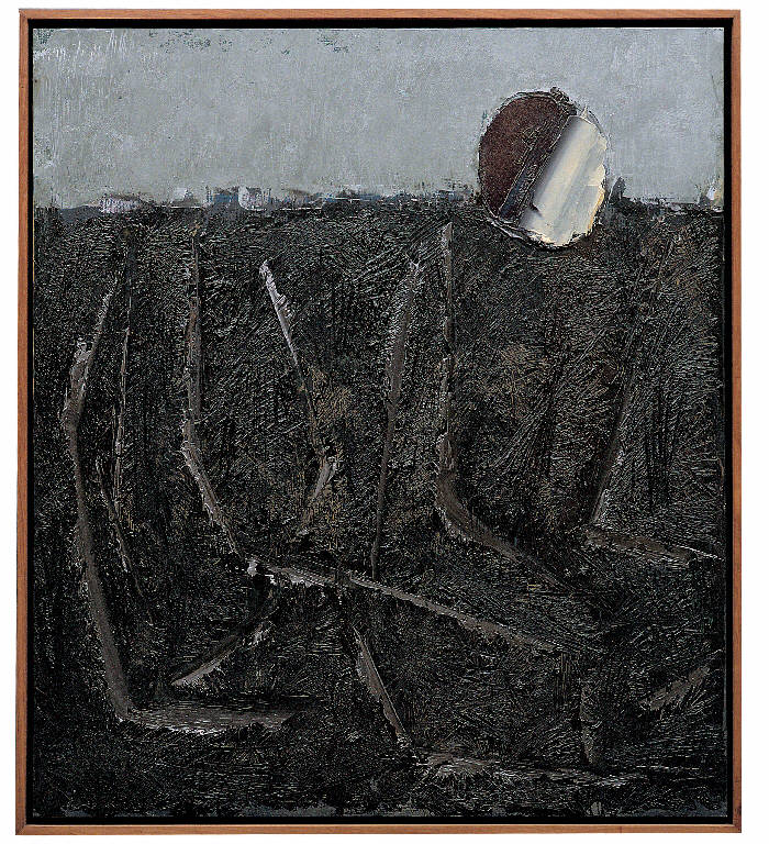E' forse la prima opera in assoluto in cui Congdon si cimenta apertamente con il paesaggio lombardo, dopo l'ouverture della serie "Roveto". La piatta uniformità del paesaggio è ricondotta allo schema compositivo più classico della pittura congdoniana: una linea di orizzonte divide la grande massa scura della terra dalla banda chiara del cielo. Quest'ultima, grazie all'impiego della polvere d'argento, assume una qualità fredda e metallica, mentre la prima presenta il consueto lavoro di incisione. Un motivo nuovo, che sembra qui sostituirsi al nero dripping delle opere newyorkesi, è però rappresentato da una serie di sottili e lampeggianti colpi di spatola che aprono nel tessuto della terra delle specie di ferite, un'allusione, forse, al reticolo di canali e "rogge" che innerva la campagna, mentre ricompare il grande disco solare, diviso in due metà, che si insinua tra cielo e terra riproponendone specularmente i rispettivi toni