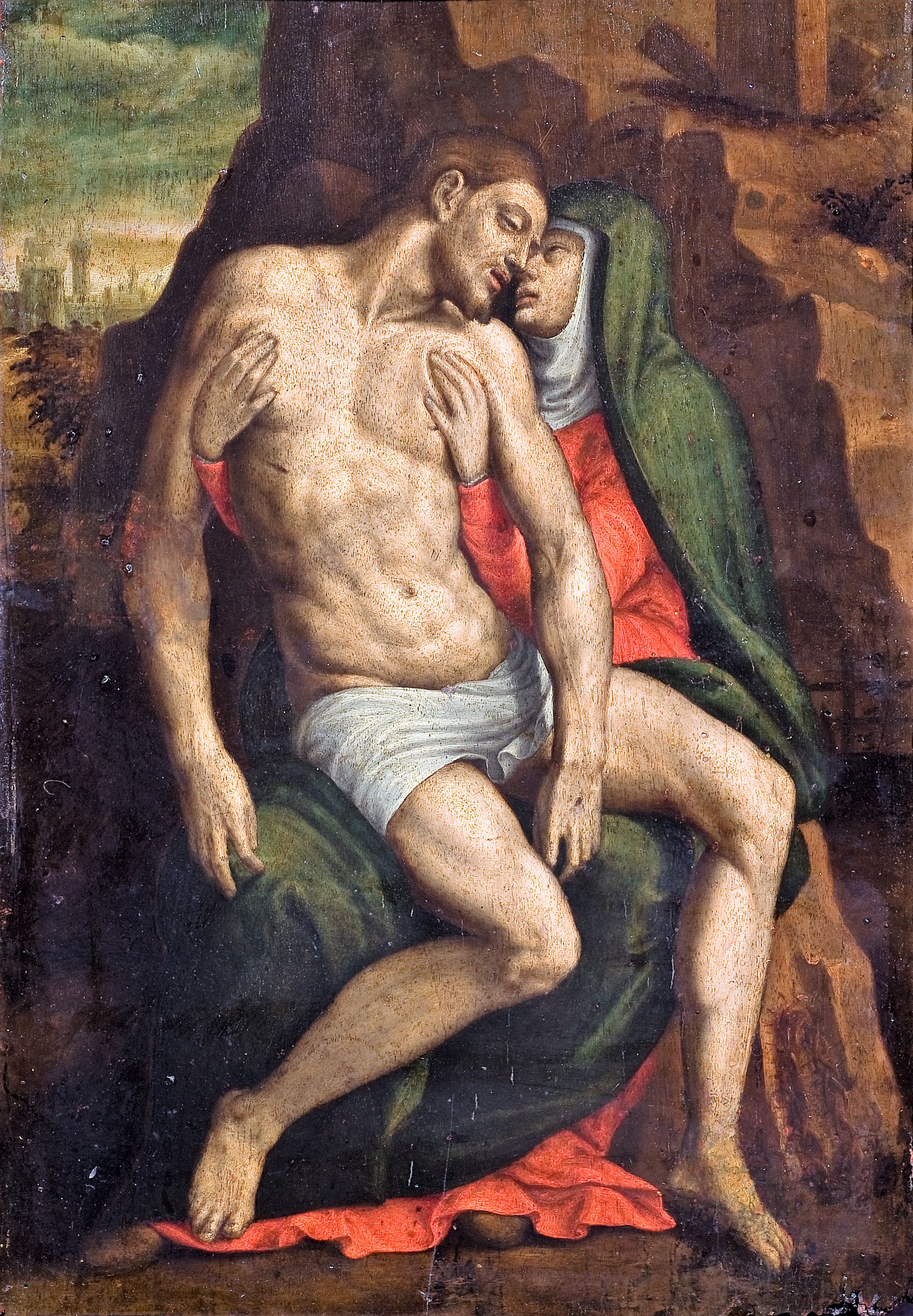 La piacevole invenzione vede la Vergine Addolorata seduta all’aperto su una roccia mentre regge con le braccia il Corpo esanime del Figlio posto sulle sue ginocchia. Il volto di Cristo si flette verso destra incontrando e toccando il profilo del volto della Madre. Sullo sfondo si intravede una città turrita
