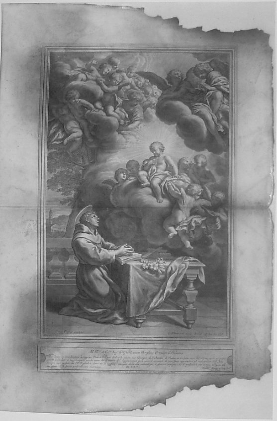 La stampa conserva sia il riferimento all'editore Gian Giacomo De Rossi, sia la dedica di Cirfo Ferri al principe Giovanni Battista Borghese, entrambe indicazioni che attualmente non compaiono più nella matrice ma che vi rimasero fino alle tirature ottocentesche (A. Grelle Iusco 1996, p. 423). Rimane da chiarire la prima citazione della stampa nell'Indice del 1677 allorchè è datata all'anno successivo dall'iscrizione. L'Indice del 1735, redatto per volere di Lorenzo Filippo De Rossi cita "S. Antonio di Padoa inginocchioni avanti al Bambino Gesù, con gloria d'Angeli, intagliato a bulino di Cornelio Bloemaert, foglio imperiale. Bajocchi 40."
