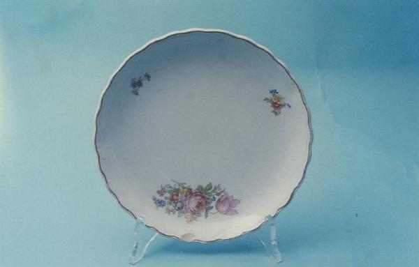 Piatto da frutta privo di tesa con orlo ondulato; fondo bianco con fiori policromi lungo il bordo; bordo rifinito con filettatura oro.