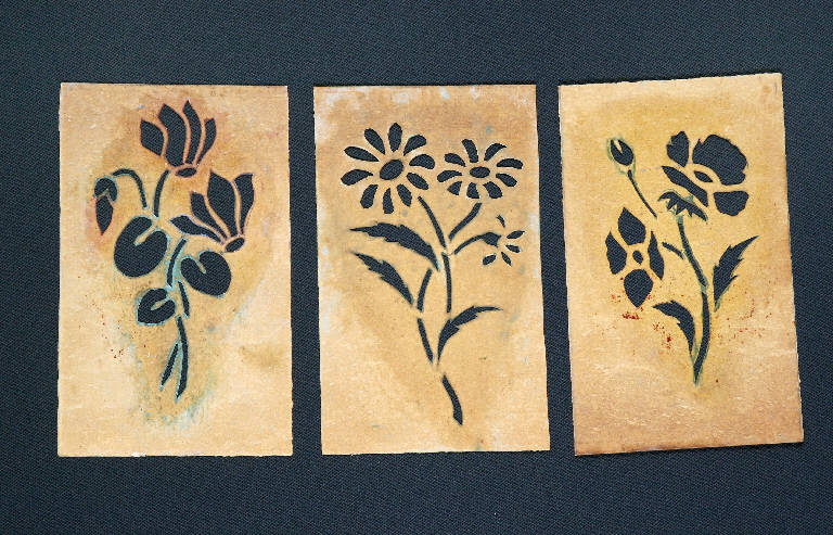 I cartoni per trasposizione, realizzati in cartoncino disegnato e ritagliato secondo un motivo decorativo, venivano utilizzati per creare decorazioni all'interno delle scenografie, consentendo di riprodurre in serie il motivo ornamentale. Le mascherine rappresentano tre fiori diversi molto dettagliati.