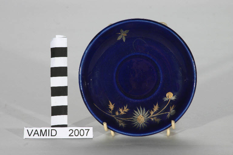 Il piattino fa parte di un servizio in blu cobalto databile tra la fine dell'Ottocento e l'inizio del secolo successivo. La coloritura blu è eseguita sottosmalto mentre i fiori sono realizzati in parte a rilievo a terzo fuoco in policromia e con oro brillante.