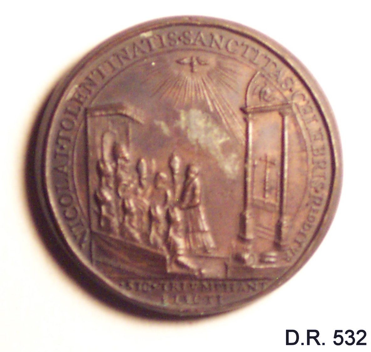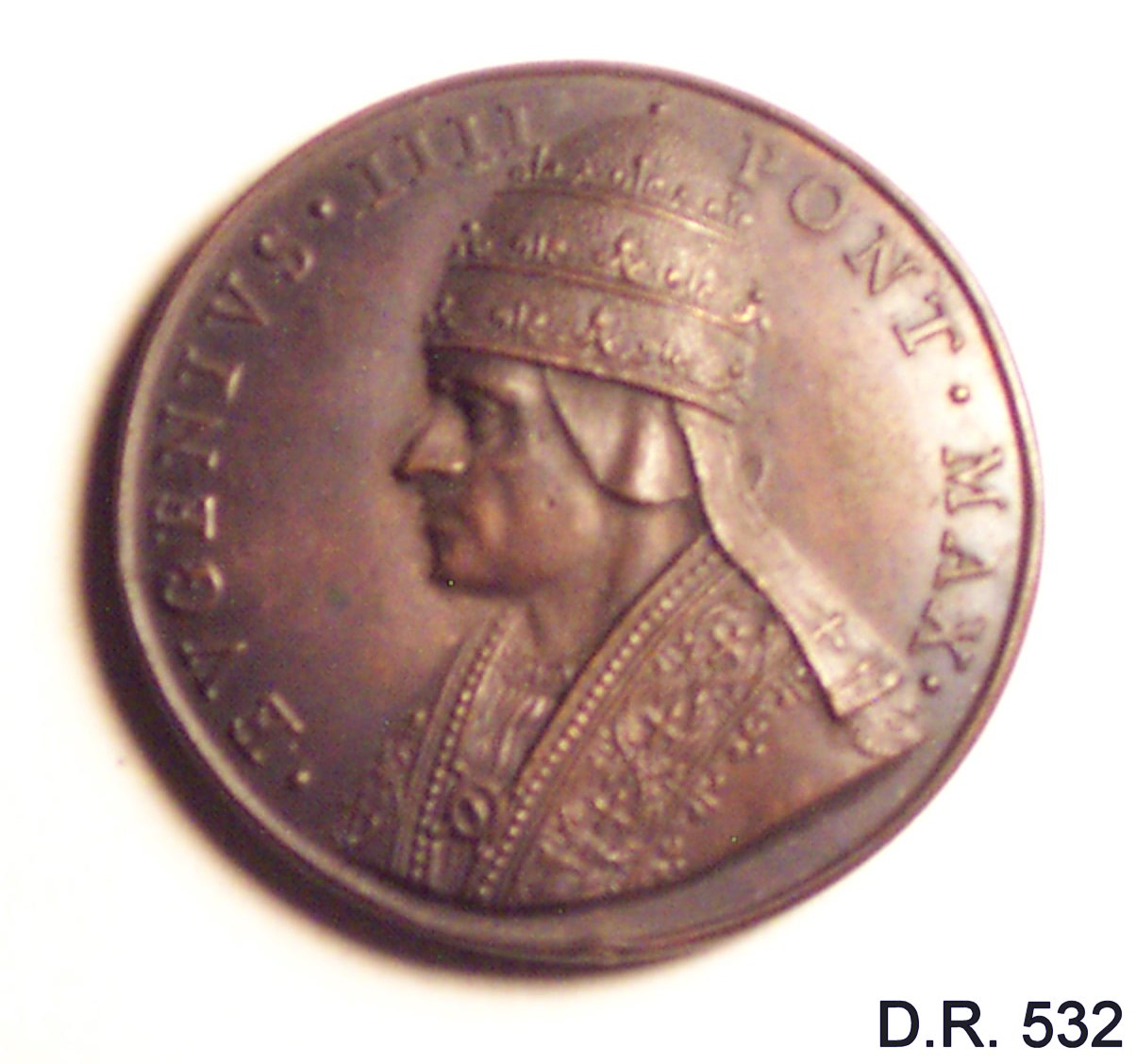 Dritto: busto di Eugenio IV volto a sinistra con piviale e triregno. Rovescio: santificazione di san nicola da tolentino. Taglio: